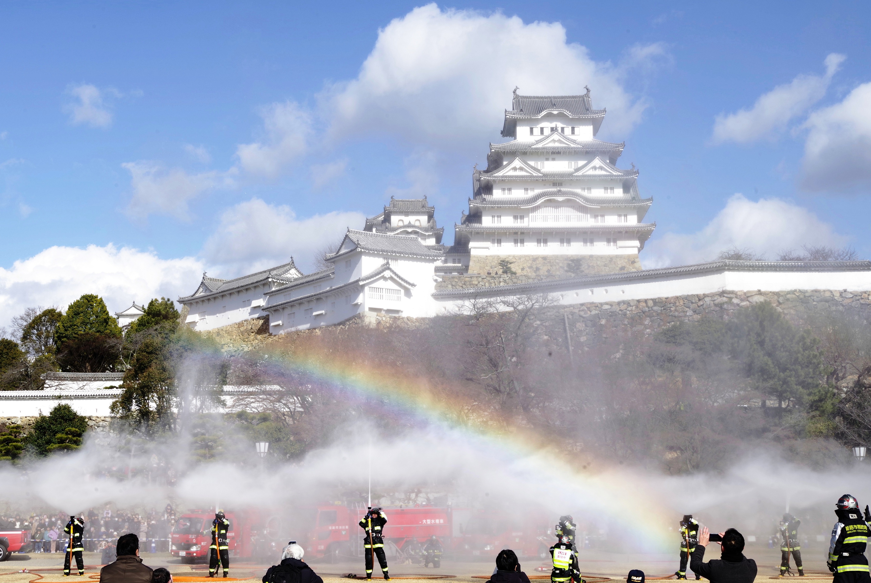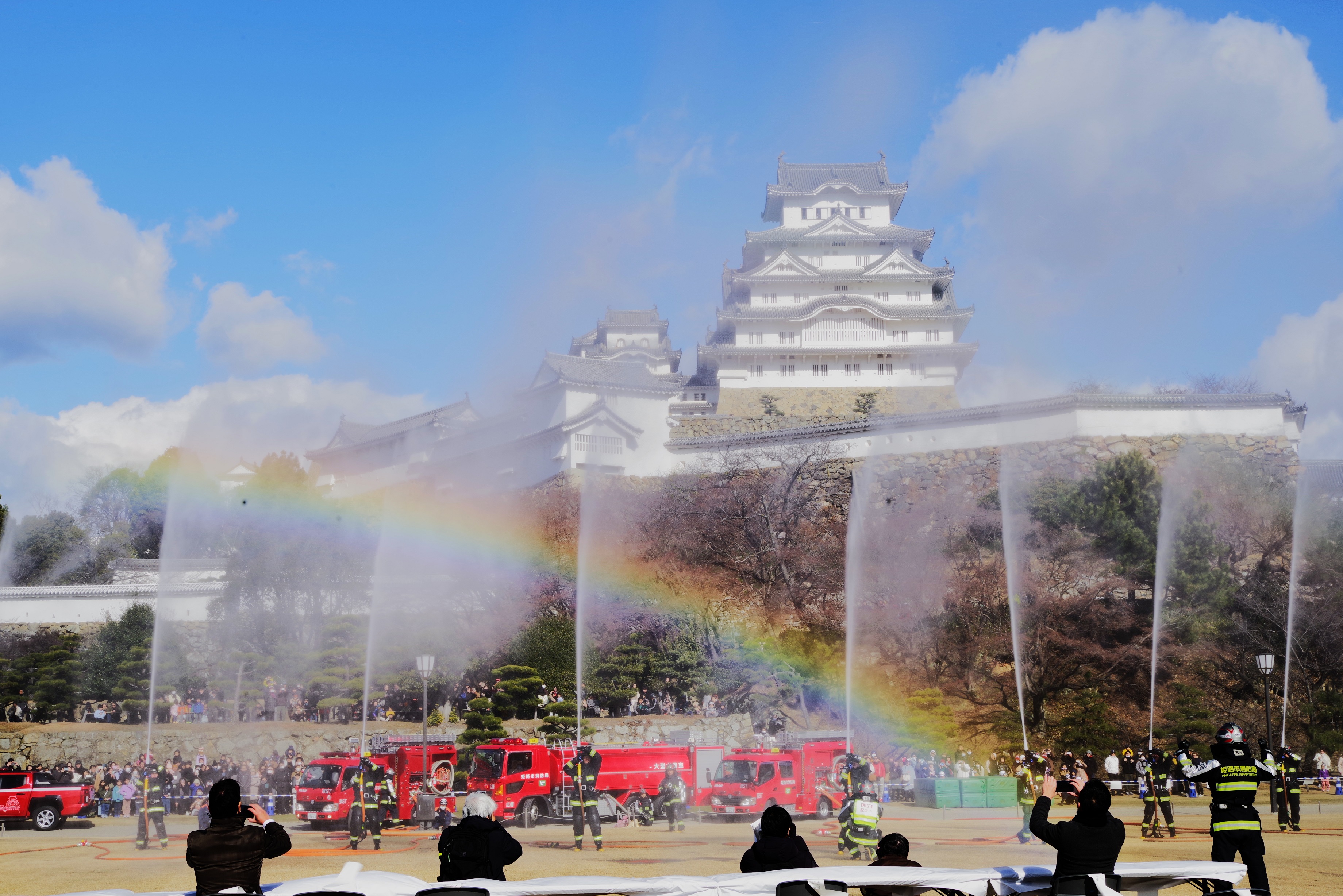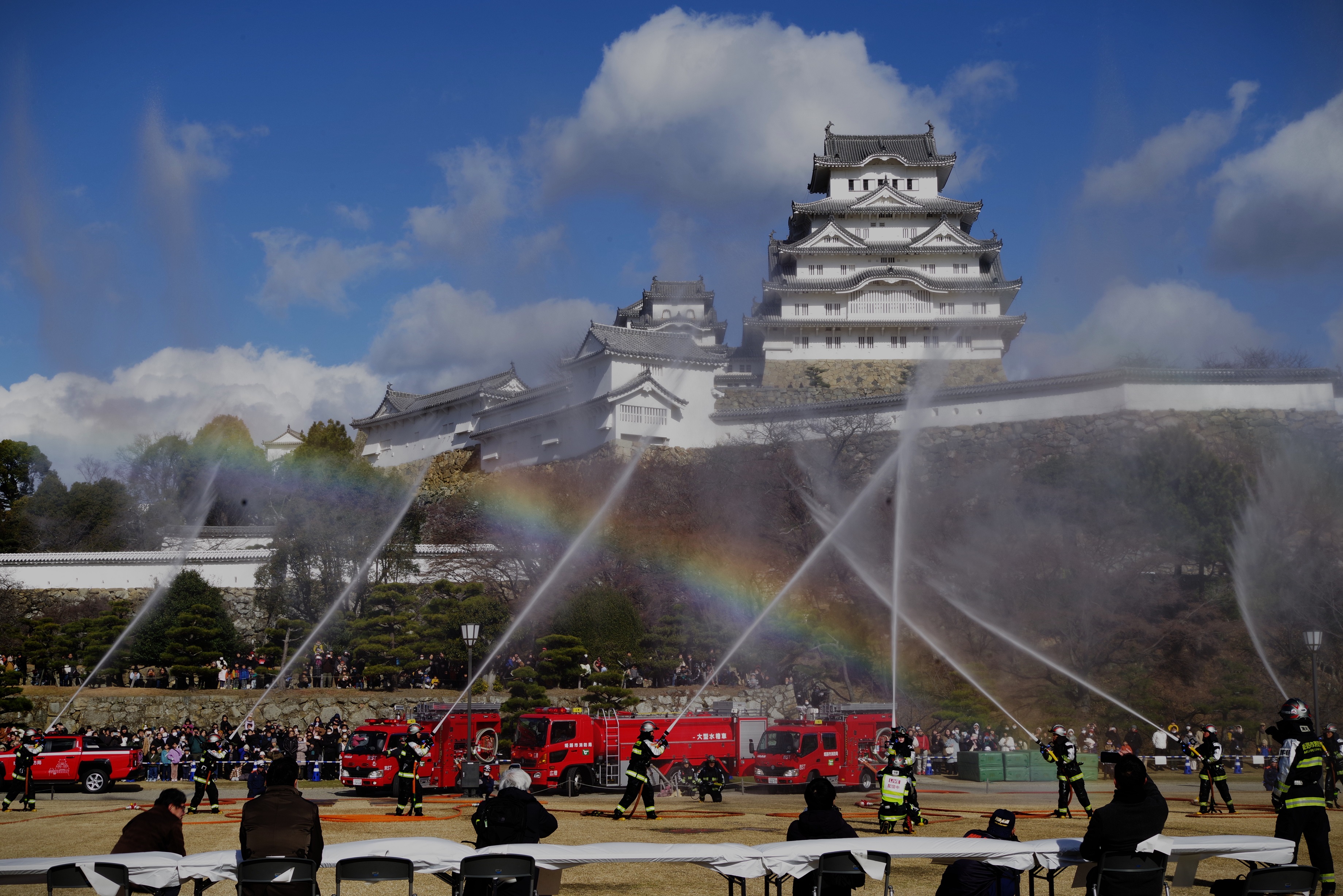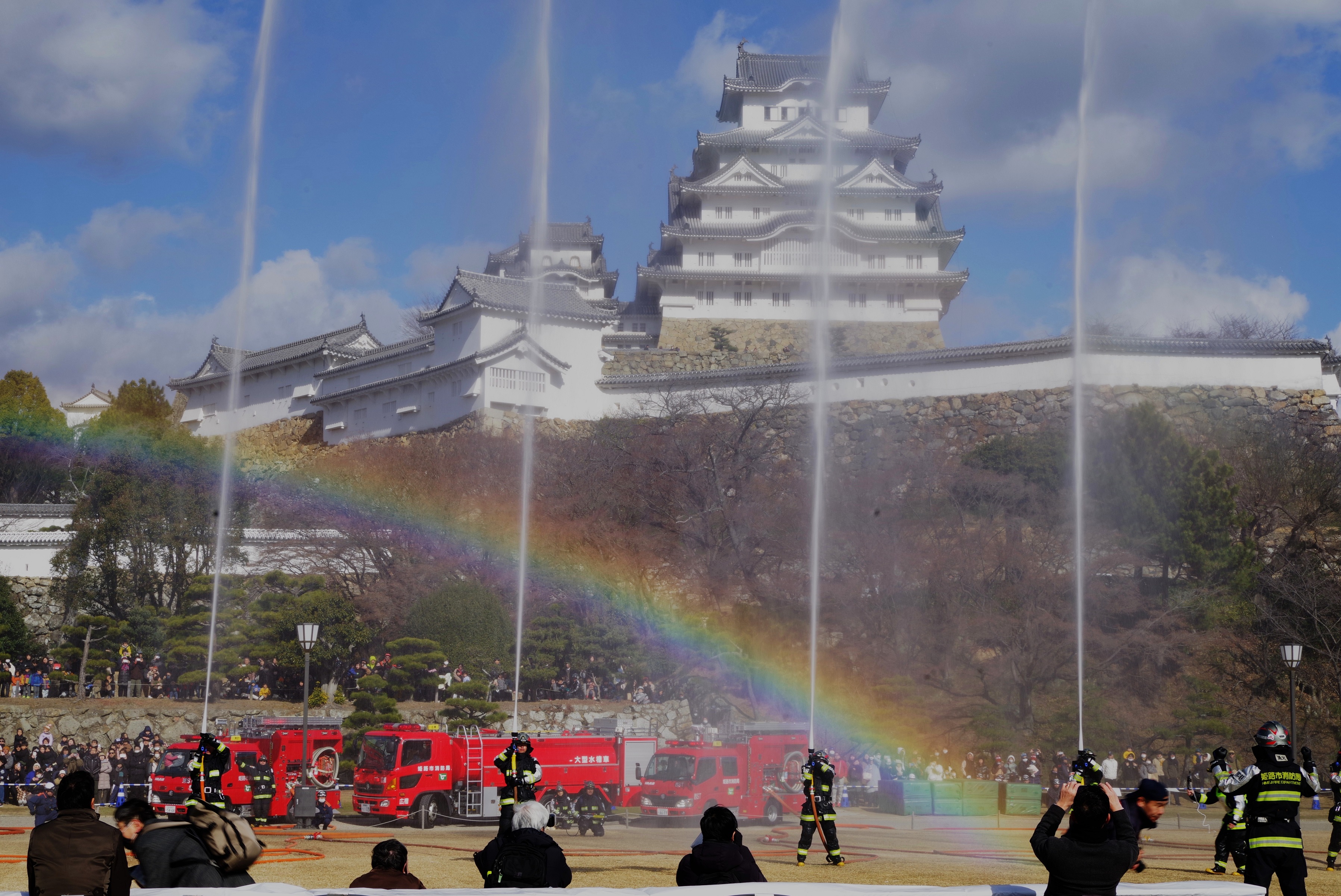 今年の出初式撮影は姫路城へでかけました。この冬一番の寒波の襲来で、風が強く時どき雪が舞う中で行われました。姫路城の出初式は初めてなので「姫路城」をバックにした写真が取れるところに陣取りました。式典は各種の表彰が続き1時間ほどあり、足の先が冷えてきて我慢の時間が長かったです。演技は梯子乗りがメインでしたが、姫路城をバックにした所で陣取ったので良い被写体にはなりませんでした。和太鼓の演技も招待席の人が邪魔になって望遠レンズでもいい角度がなかった。一斉放水は、天候も回復して朝日のあたる中での放水演技でしたので、「虹」ができる位置で思った写真がとれました。