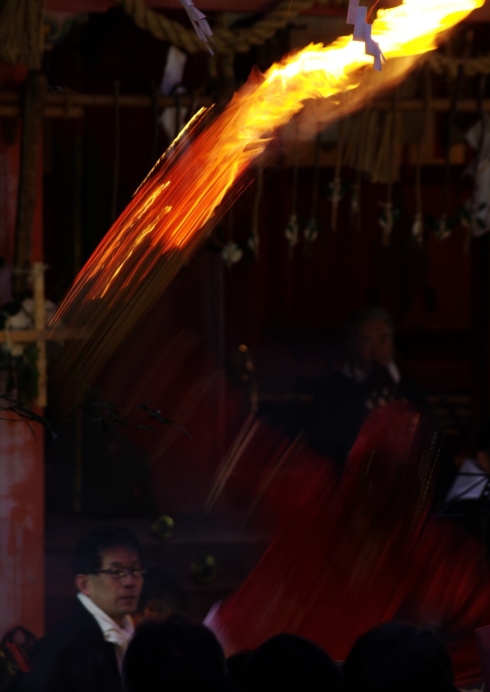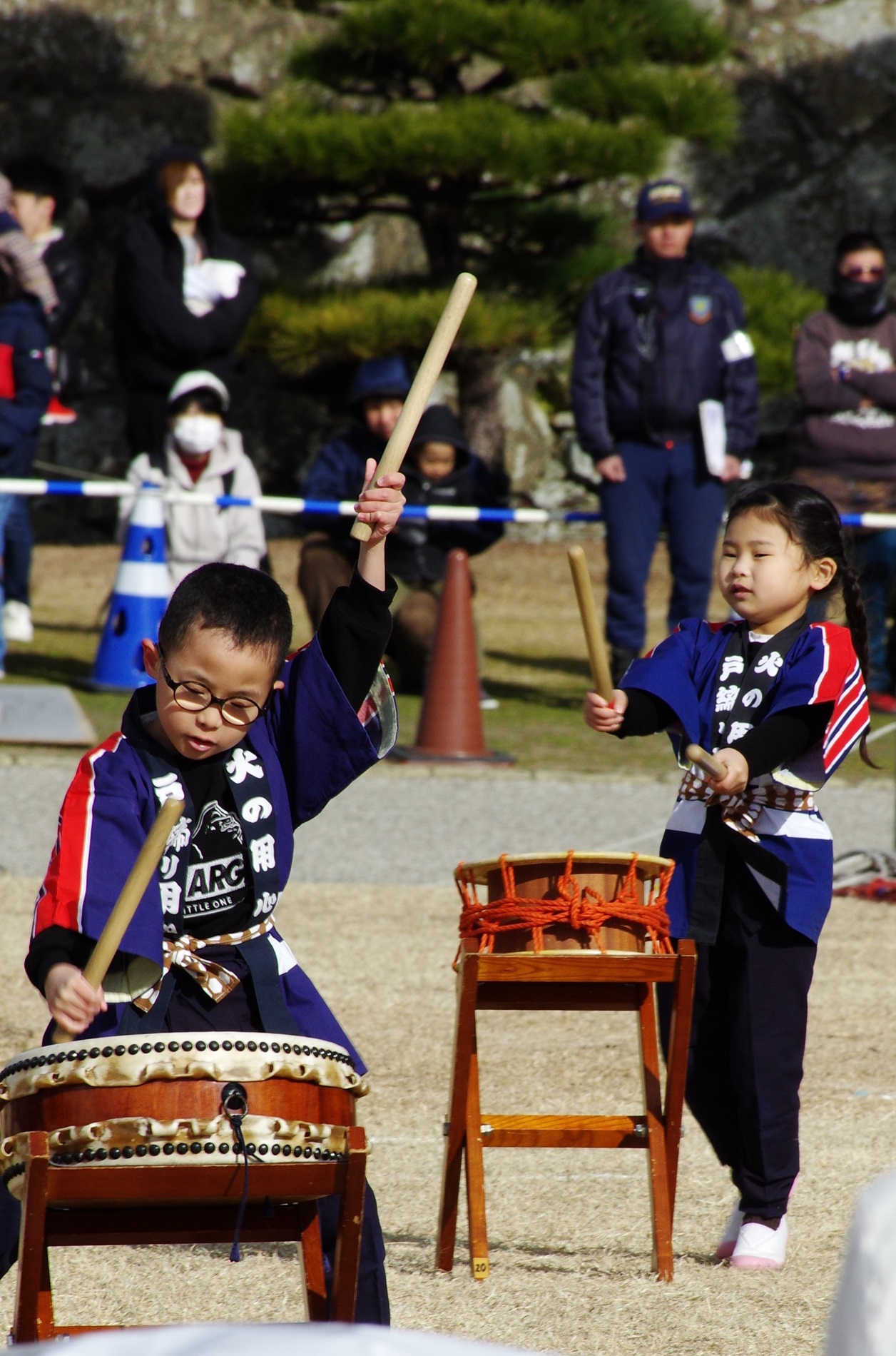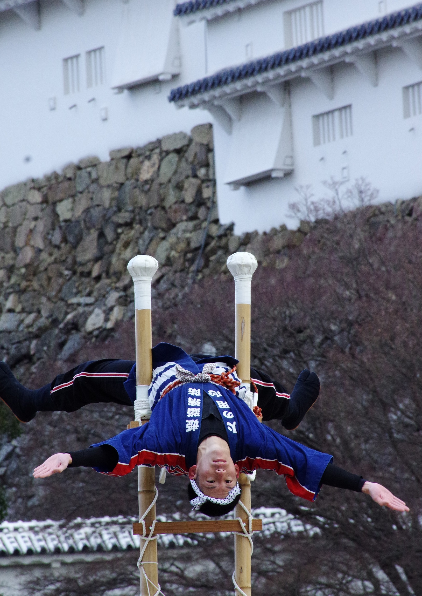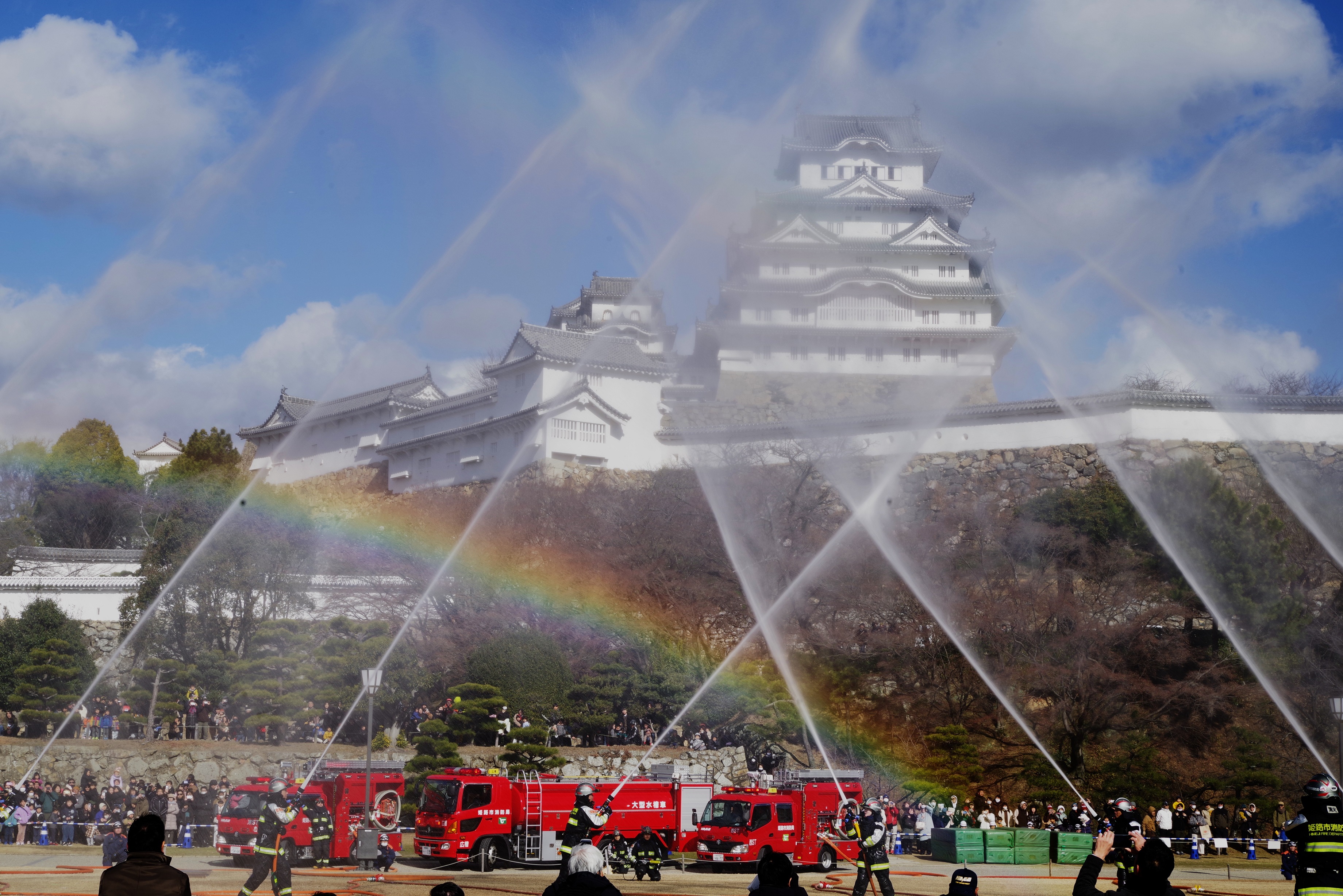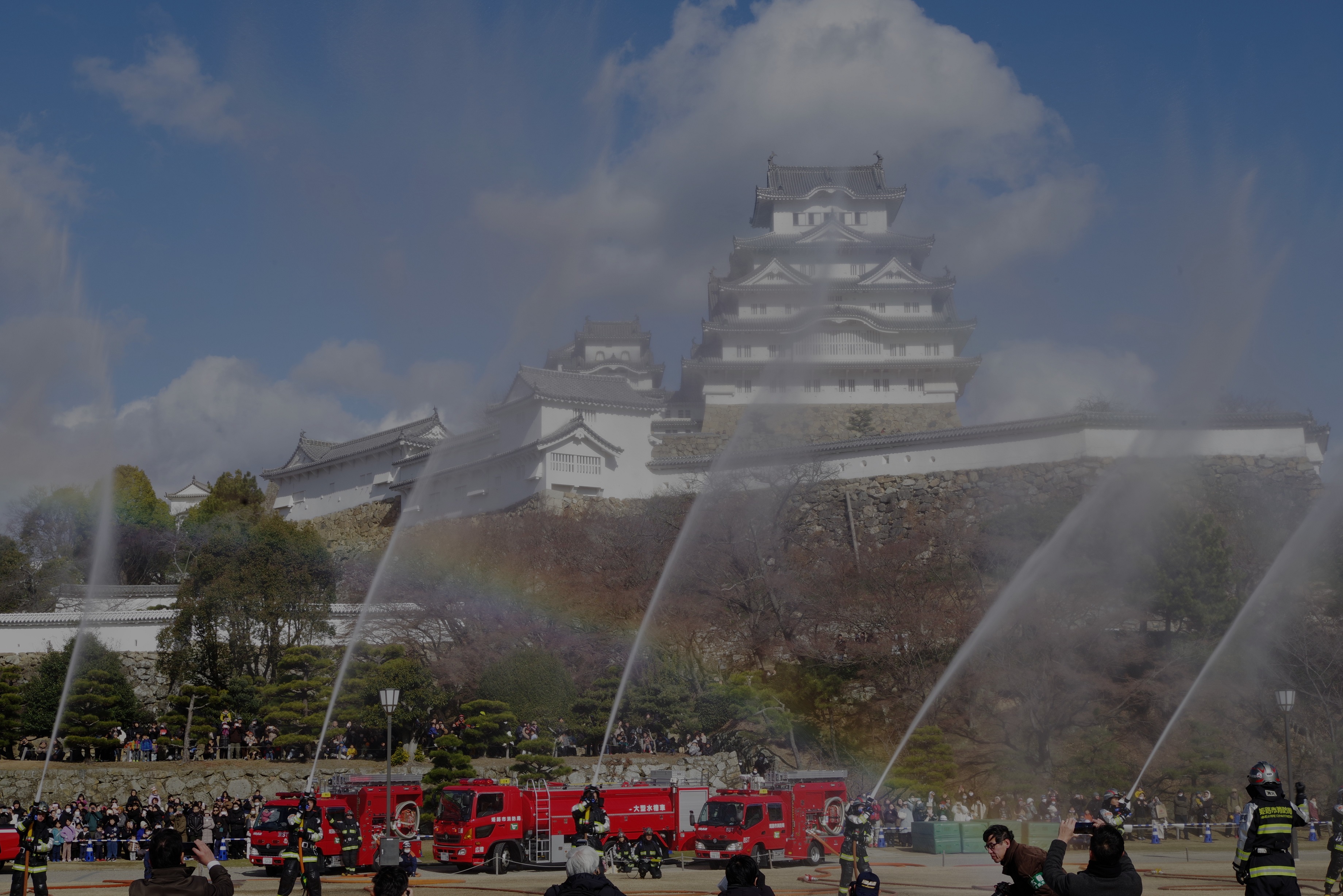 今年の出初式撮影は姫路城へでかけました。この冬一番の寒波の襲来で、風が強く時どき雪が舞う中で行われました。姫路城の出初式は初めてなので「姫路城」をバックにした写真が取れるところに陣取りました。式典は各種の表彰が続き1時間ほどあり、足の先が冷えてきて我慢の時間が長かったです。演技は梯子乗りがメインでしたが、姫路城をバックにした所で陣取ったので良い被写体にはなりませんでした。和太鼓の演技も招待席の人が邪魔になって望遠レンズでもいい角度がなかった。一斉放水は、天候も回復して朝日のあたる中での放水演技でしたので、「虹」ができる位置で思った写真がとれました。